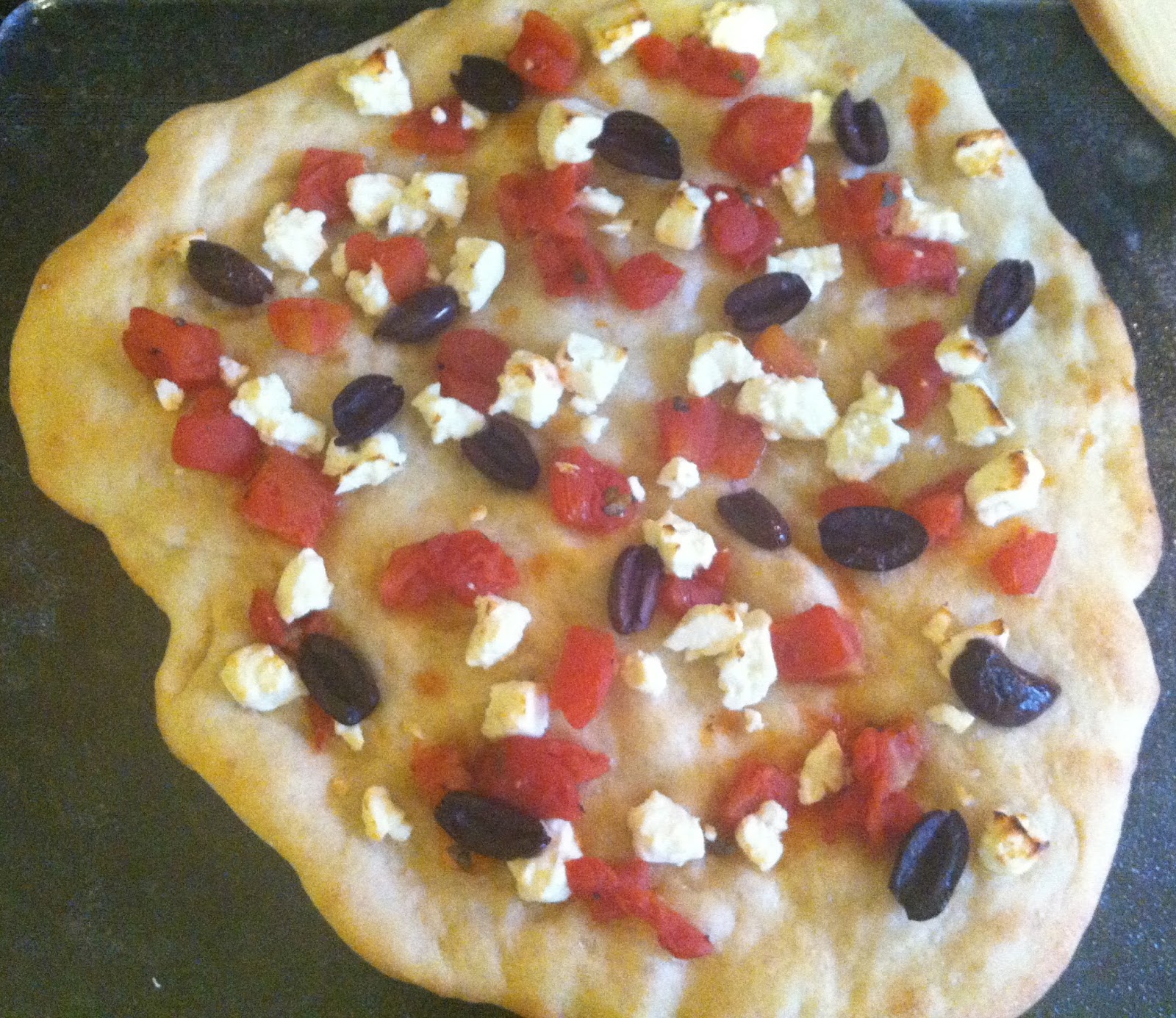 Flattened out and placed on a hot pizza stone. This would have been easier to do if I had chilled the dough a little first, but sometimes pregnant ladies get impatient when it comes to food.